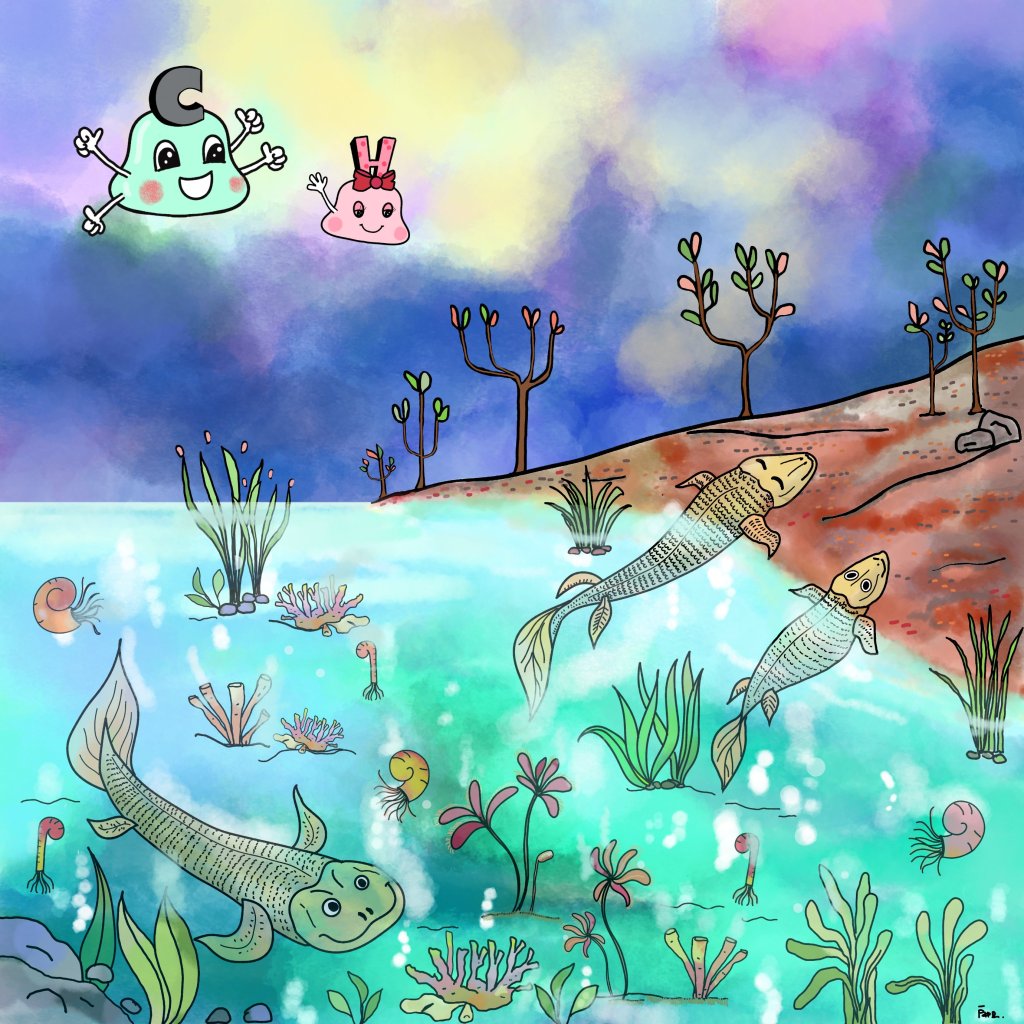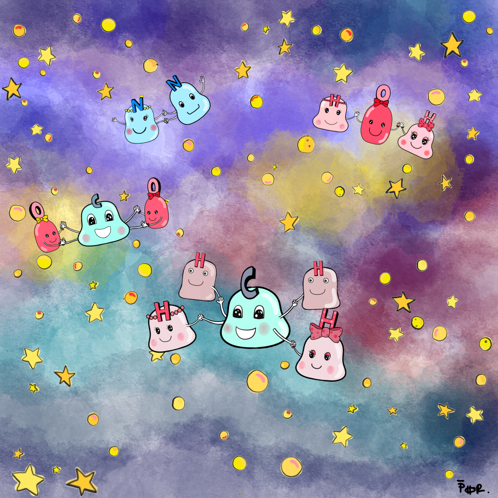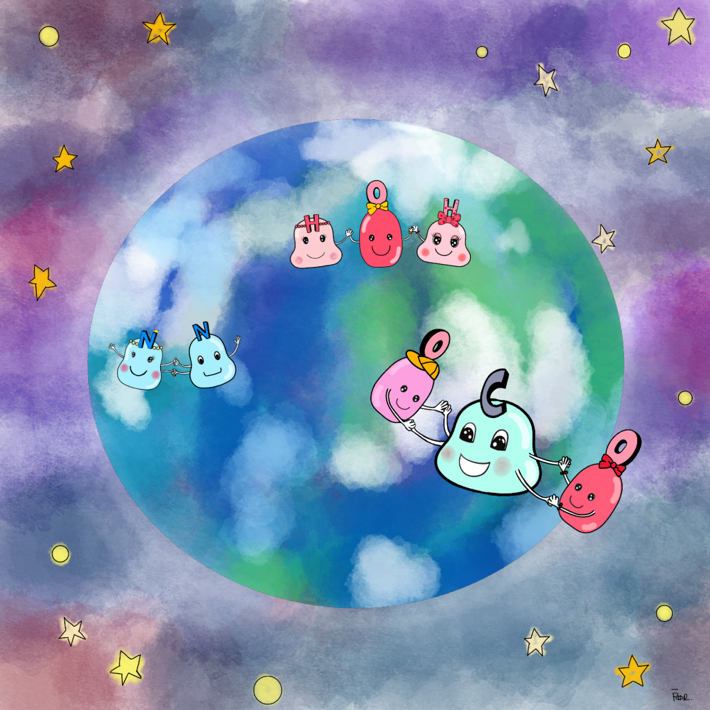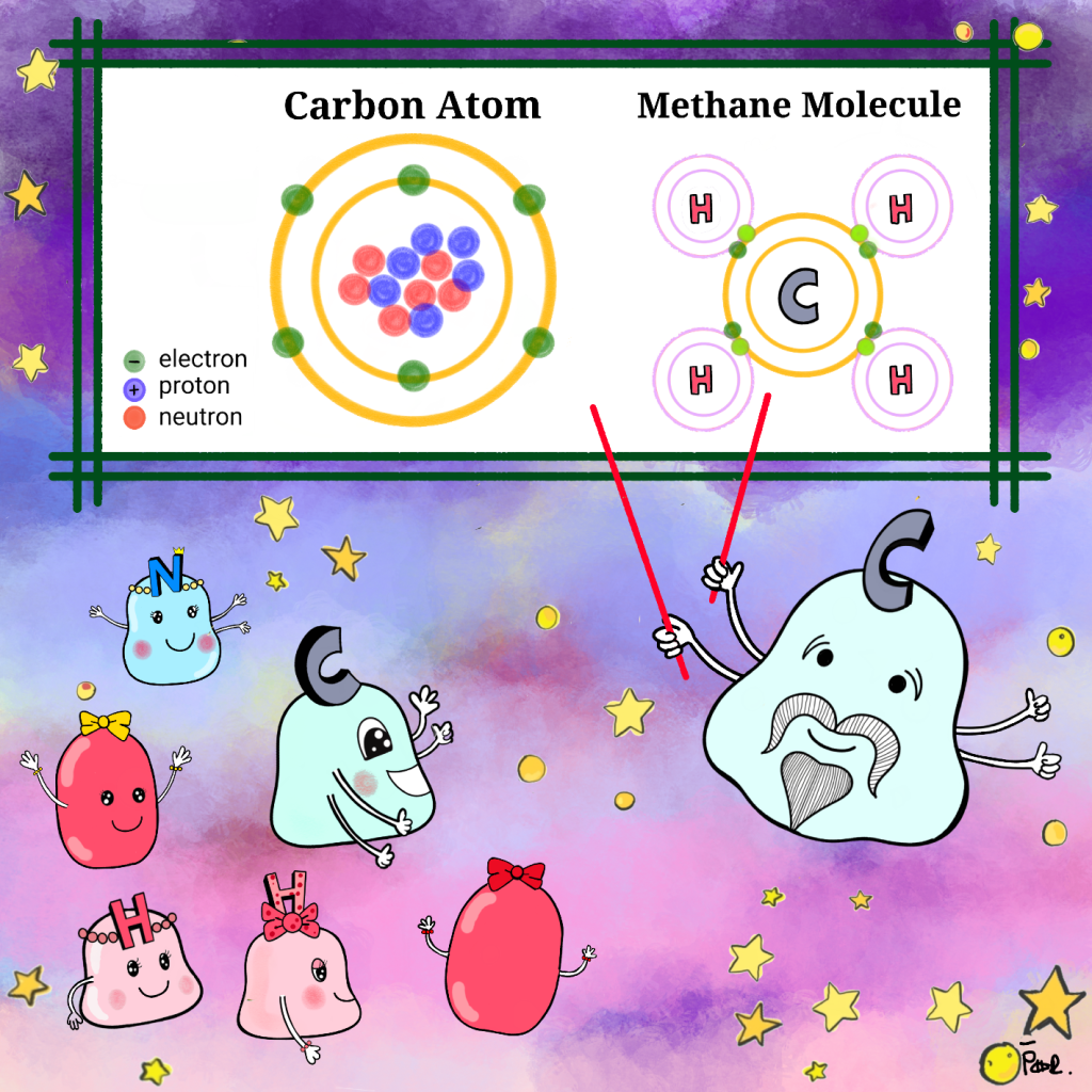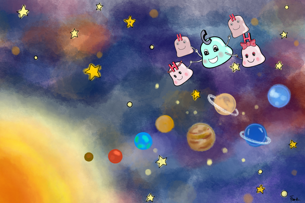 The story is about a carbon atom and a hydrogen atom (Henry and Lauren), they were born from a broken star. They had been traveling through the galaxy, found solar system and helped creating life on our planet Earth